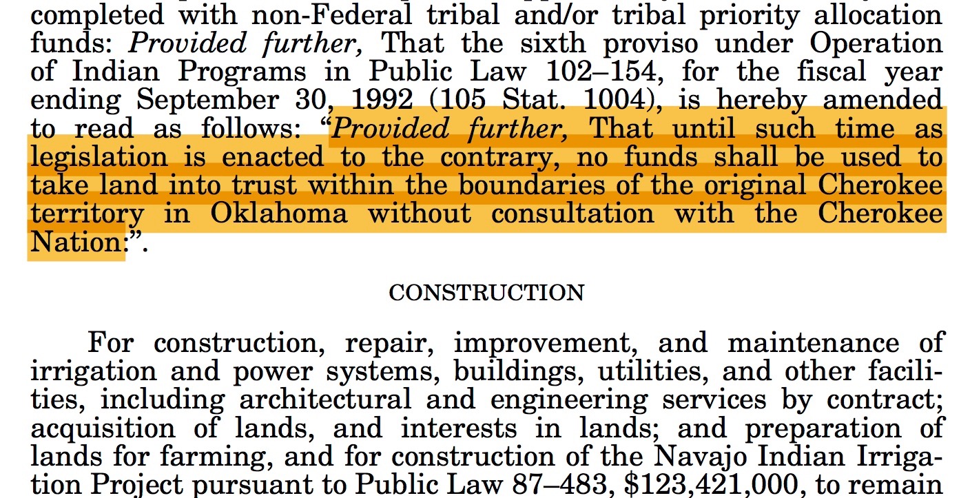 A provision in the Omnibus Consolidated and Emergency Supplemental Appropriations Act mentions "consultation" of the Cherokee Nation but does not override a regulation that requires the tribe's consent regarding land-into-trust applications, a federal judge ruled on May 31, 2017. Source: Public Law No. 105-277