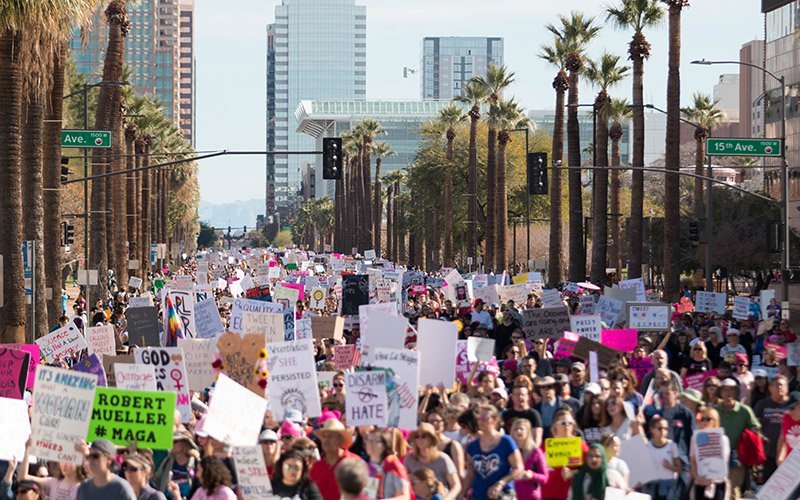 The streets of downtown Phoenix are filled with people as the Phoenix Women's March proceeds back toward the State Capitol. Photo by Delia Johnson / Cronkite News