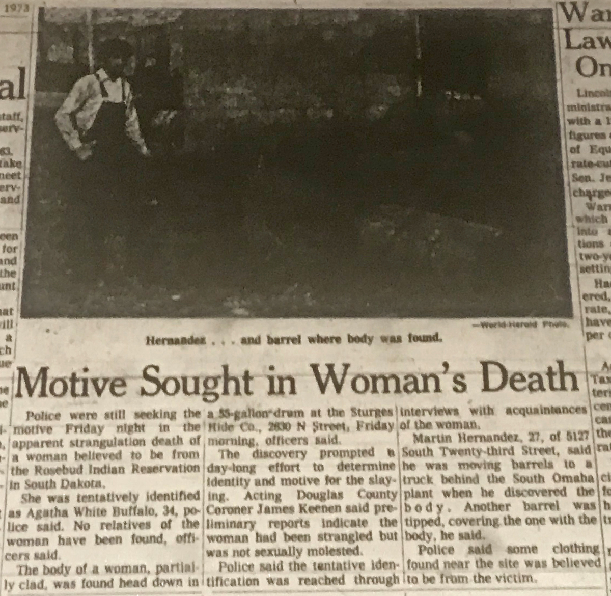 As for White Buffalo, her body was found November 16, 1973, inside a barrel at the Sturges Hide Company in south Omaha, according to an article published the next day in the Omaha World-Herald. A 27-year-old man, Martin Hernandez, was moving barrels behind the plant when he found her body. Police later found some of her clothing nearby.