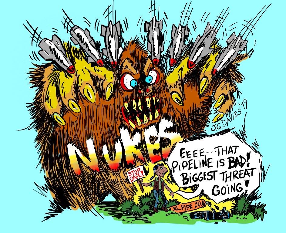 Russian Tsar Bomba, developed in 1956, which has a total destruction radius of 22 miles. If it went off over Ellsworth, all the people living in Summerset, over 20 miles away, would eventually die. If you were shopping at Target in Rapid City, you’d just be vaporized. Top that threat, XL pipeline.