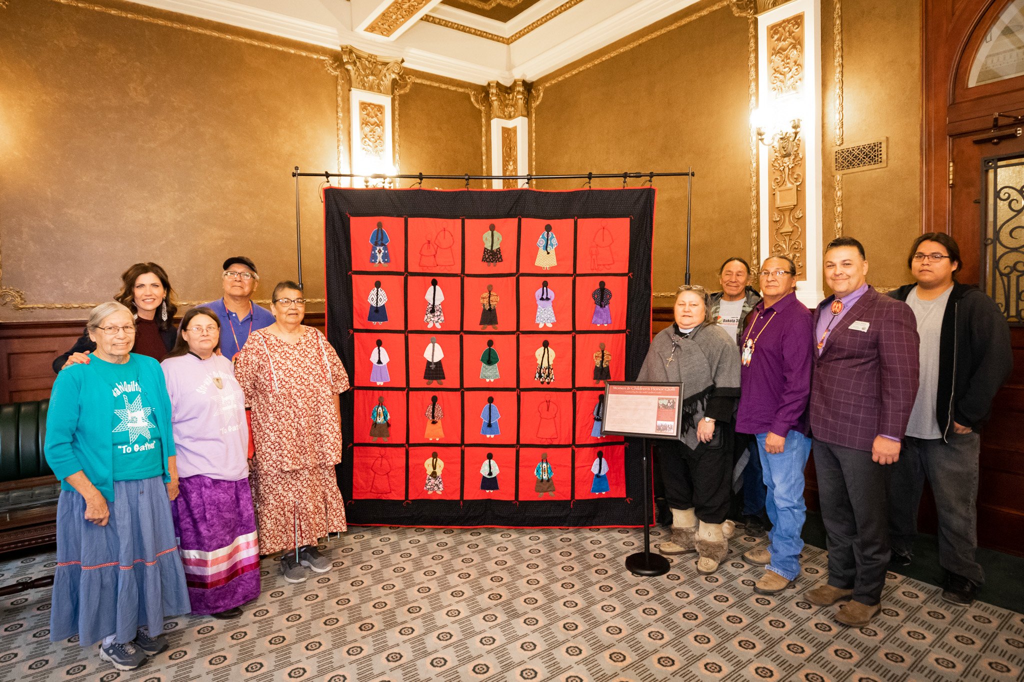 Native American women are murdered at a rate 10 times higher than any other demographic. Four out of five experience violence in their lifetimes. “Here in South Dakota, I’m hoping we lead the nation in stopping it,” Noem pronounced. Event participant Jimmy Hallum explained the provenance of the quilt. Organizers planned the ride that Noem joined as a link between today’s unchecked violence against native women with that perpetrated ever since more than a century ago. It spotlighted the imprisonment of women and children at Ft. Randall on today’s Crow Creek Sioux Indian Reservation in the leadup to the mass execution of their warriors at Mankato, Minnesota, an outcome of the 1862 U.S.-Dakota War. More than 300 captive women and children died after succumbing to starvation and nearly unspeakable denigration, according to historical research. Hallum winces at “the horrors the women went through, watching their children die and suffering abuses from the very soldiers sent there to guard them.” So, his group rode to Pierre, to the capitol, “to bring awareness about the abuses that occurred to the women back then, also to the ones suffering today with all the missing and murdered indigenous relatives,” he said.This quilt has some truly special meaning. It was presented back in June, following a horseback ride for MMIW. Now, the quilt will be permanently displayed in our Capitol - such an honor! I am humbled by this gift and am grateful for the opportunity to display it. pic.twitter.com/UlJ289rguW