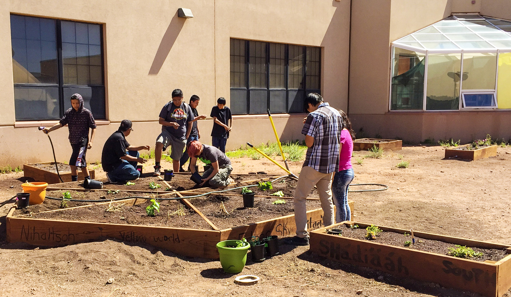 Navajo youth learn gardening in a raised bed, with support from Partnership With Native Americans. Amid COVID-19, Native Americans young and old are learning how to grow their own food again. Photo courtesy of Partnership With Native Americans