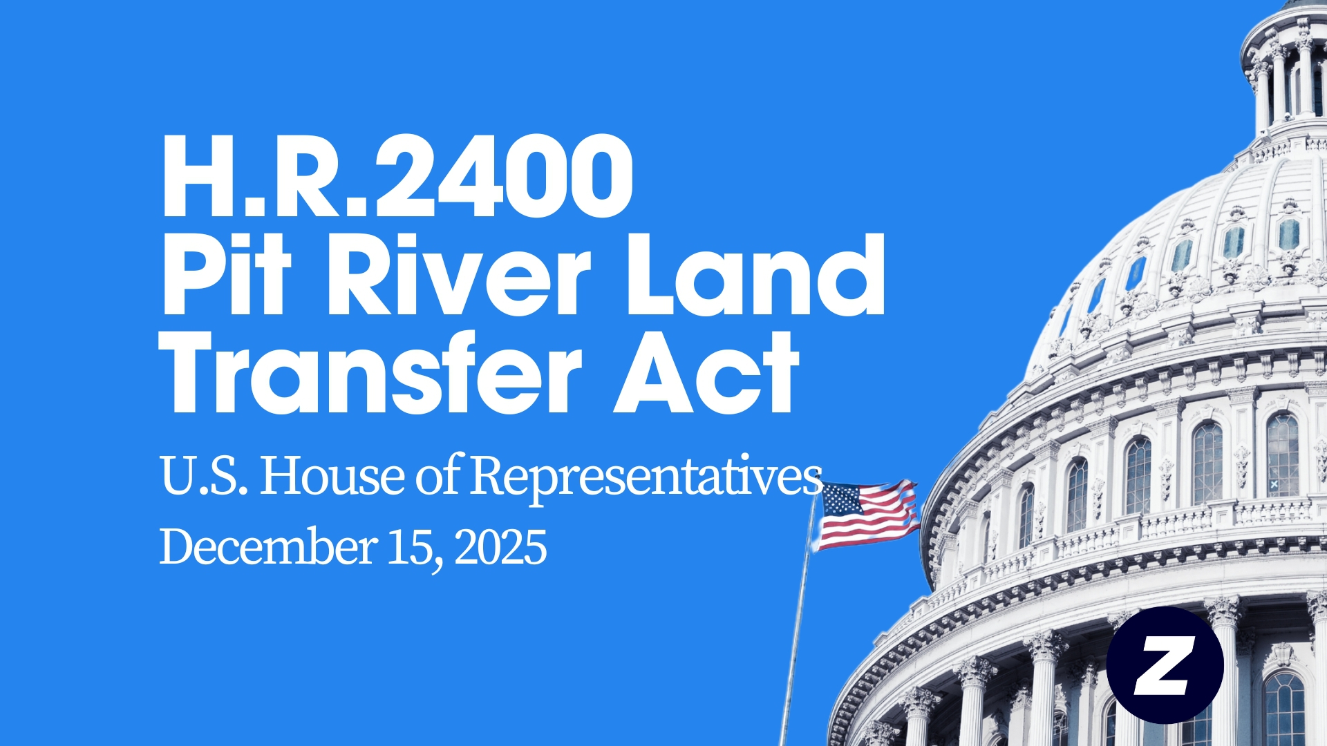 The U.S. House of Representatives considers H.R.2400, the Pit River Land Transfer Act of 2025, on December 15, 2025.