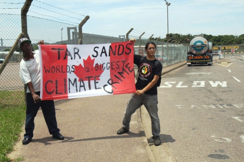 Protesters at U.N.climate change summit in Durban, South Africa, link tar sands crude to global warming. Photo courtesy Indigenous Environmental Network.