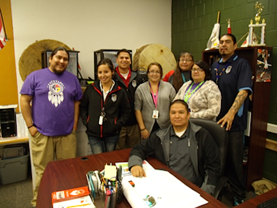 Staff of Ateyapi program. Standing from left are Arlo Iron Cloud Sr., Larissa Looking Elk, Robbie Yellowhawk, Amber Twiss, Rhonda Yankton, Lisa Dobyns, Fred Sitting Up Jr. Sitting: Whitney Rencountre II